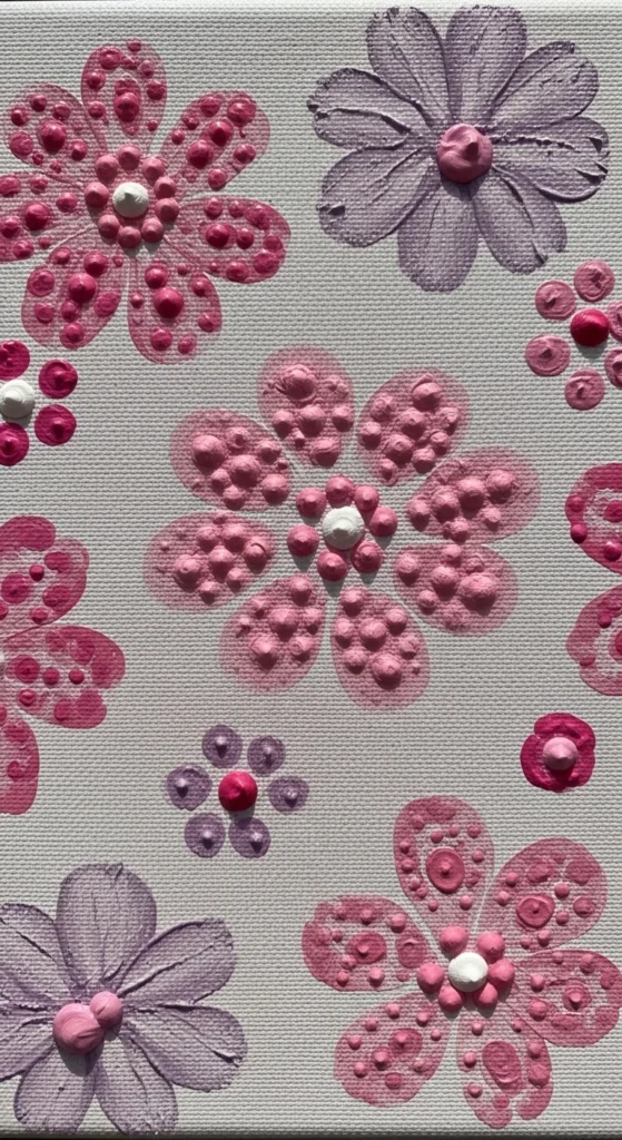 Use cotton swabs to form petals and the back of a brush for flower centers. Layer dots for a dimensional look and mix colors for variation. It’s precise yet very beginner-friendly. Perfect for floral-themed walls or seasonal accents. The method is inexpensive and easy to repeat across multiple canvases for a cohesive display.