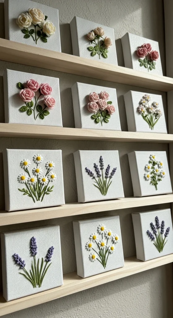 Decorate mini canvases for shelves, counters, or mantels. Small florals, dots, or geometric patterns work well in this format. They’re beginner-friendly and quick to complete. Multiple pieces can be grouped for a cohesive display. Mini canvases add color and personality to small spaces without overwhelming them.