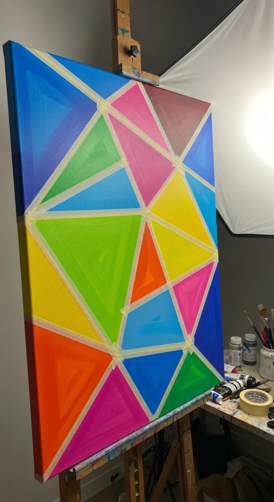 Painter’s tape makes it easy to create sharp geometric designs. Mask areas in triangular shapes and paint over them, then peel the tape carefully. Triangles can be large or small, uniform or random, to achieve a modern abstract look. This method allows beginners to create clean, precise edges without freehand drawing. Try mixing bright and muted colors for added visual interest.