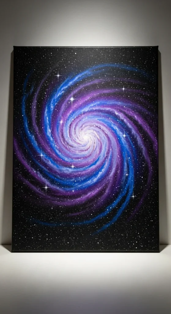 Create a cosmic scene by layering dark and bright sponged colors. Flick white paint for stars and optionally add metallic highlights. This technique is beginner-friendly but creates a dramatic effect. It works as a standalone piece or in a themed gallery wall. Ideal for bedrooms, study rooms, or creative studios.