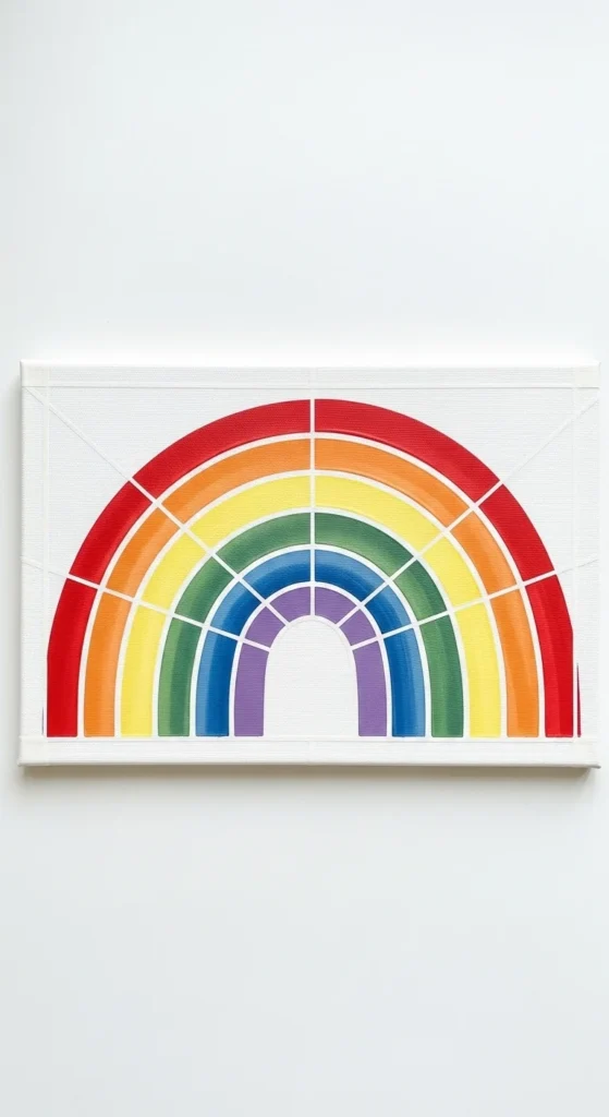 Use tape to section off rainbow arcs on your canvas and paint each section in your chosen color. Once dry, remove the tape to reveal crisp, clean lines. Muted tones create a sophisticated effect, while bright hues are playful and cheerful. This project is beginner-friendly and works for small or large canvases. It’s a fun way to add color to children’s rooms or creative spaces.