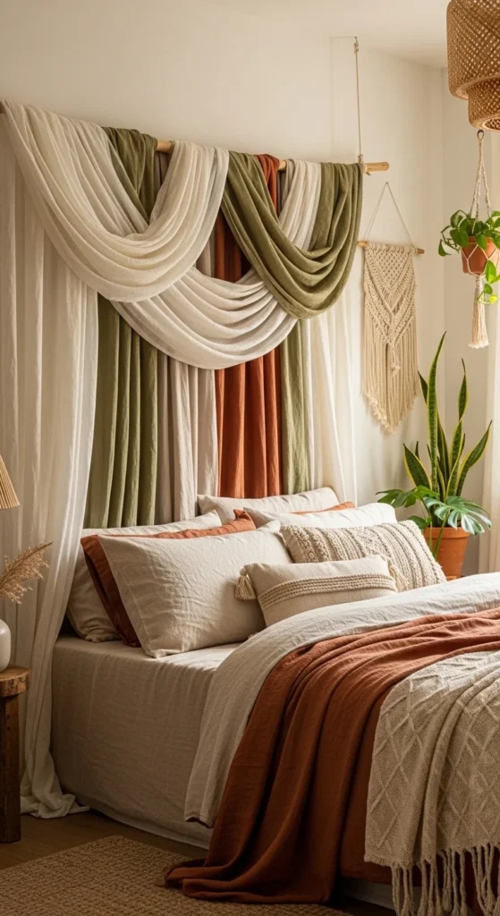 Drape long fabric scraps behind a bed to create a bohemian-inspired headboard. Easy to remove or swap, making it renter-friendly. Adds color, softness, and texture to the bedroom without permanent changes. No sewing skills needed, perfect for beginners. An inexpensive and creative way to upgrade your sleeping space.