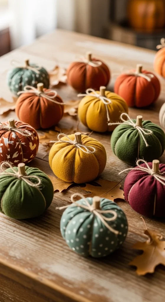 Create soft, fabric pumpkins by tucking or gluing scraps around foam or plastic bases. No sewing skills are required, making it beginner-friendly. They add seasonal charm and soft texture to shelves or tables. Low-cost and reusable for multiple seasons. A fun, creative way to celebrate fall while using up scraps.