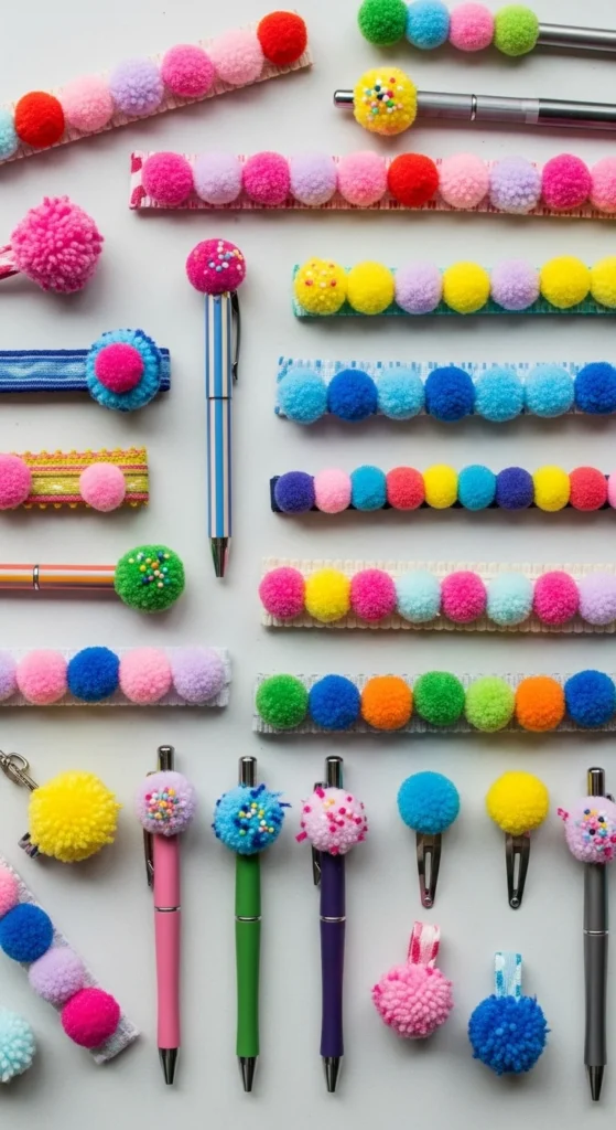 Create small pom-poms from leftover fabric strips and attach them to pens, trims, or even pillows. Lightweight, beginner-friendly, and very inexpensive. Adds playful texture and color to accessories or decor. A simple craft that’s perfect for using up tiny scraps creatively.