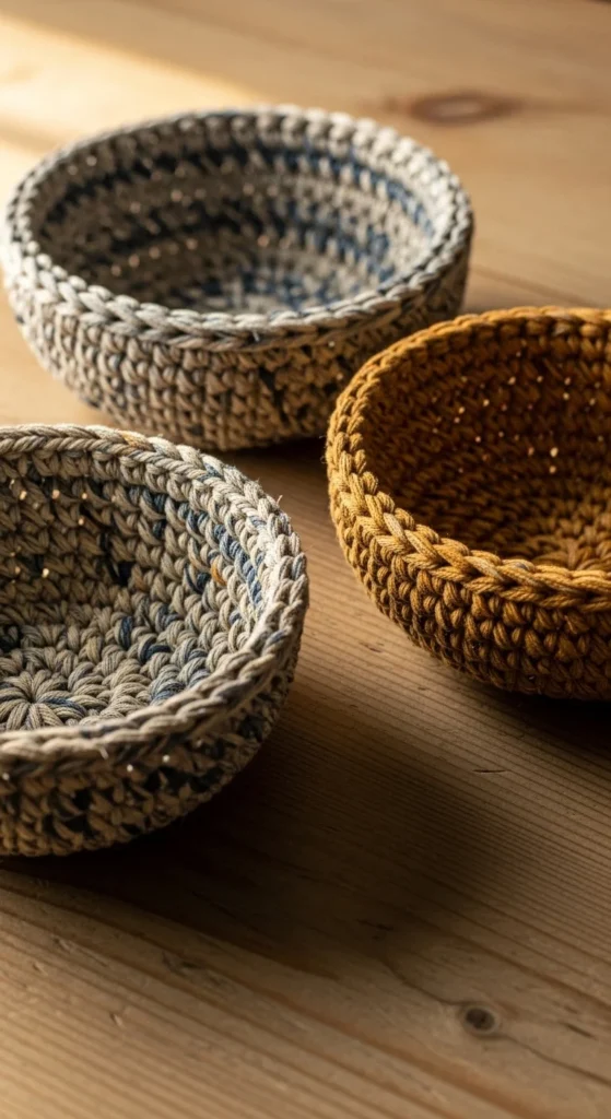 Cut strips of fabric and crochet them into small decorative bowls. Perfect for storing jewelry, keys, or trinkets. Beginner-friendly with simple crocheting or even no-hook weaving methods. Budget-conscious, eco-friendly, and adds soft texture to any surface. A creative way to turn scraps into functional decor.