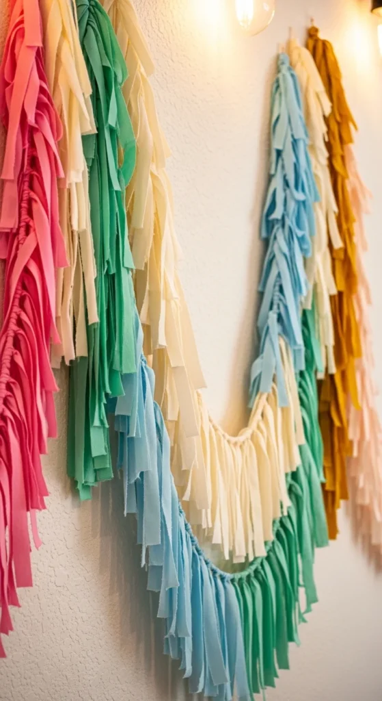 Cut strips of leftover fabric and tie them onto a string or cord to create a whimsical garland. Hang it above windows, beds, or along shelves for playful decoration. No-sew construction makes it ideal for beginners or renters. It’s a cost-effective way to brighten up your space while reusing scraps. Seasonal or festive swaps make it a versatile decor piece.