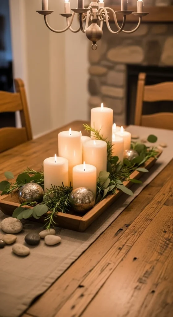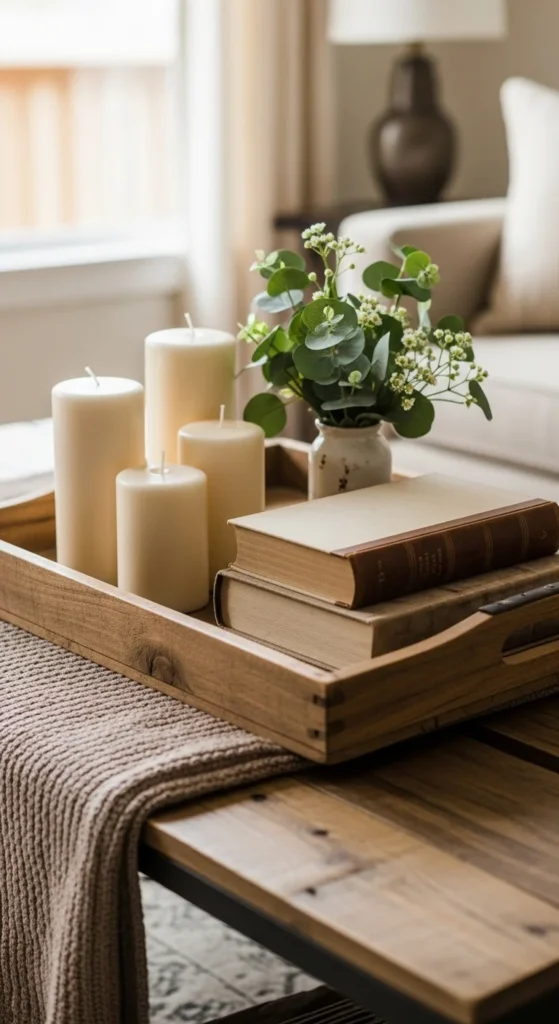 Wooden tray centerpieces bring farmhouse warmth to tables. DIY trays can be styled seasonally or kept minimal. They help organize decor while creating balance. Natural wood tones enhance rustic charm. This idea works beautifully for dining or coffee tables.