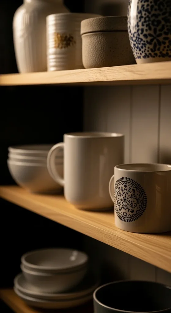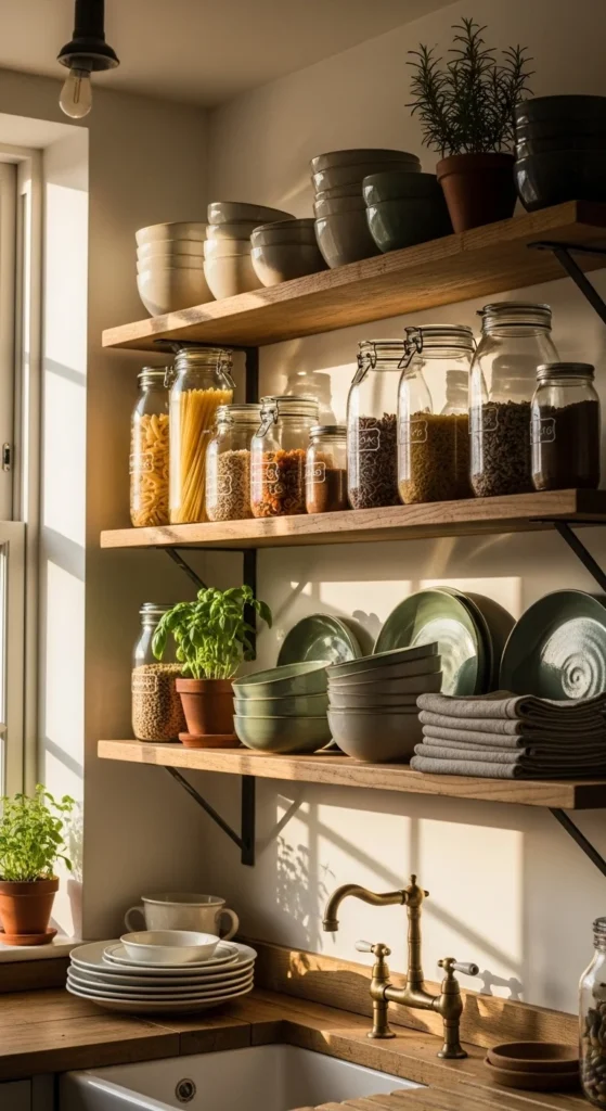 Open shelving is a farmhouse favorite. DIY shelves allow customization in size and finish. They make kitchens feel open and inviting. Displaying simple dishes adds charm and function. This idea blends practicality with rustic style.