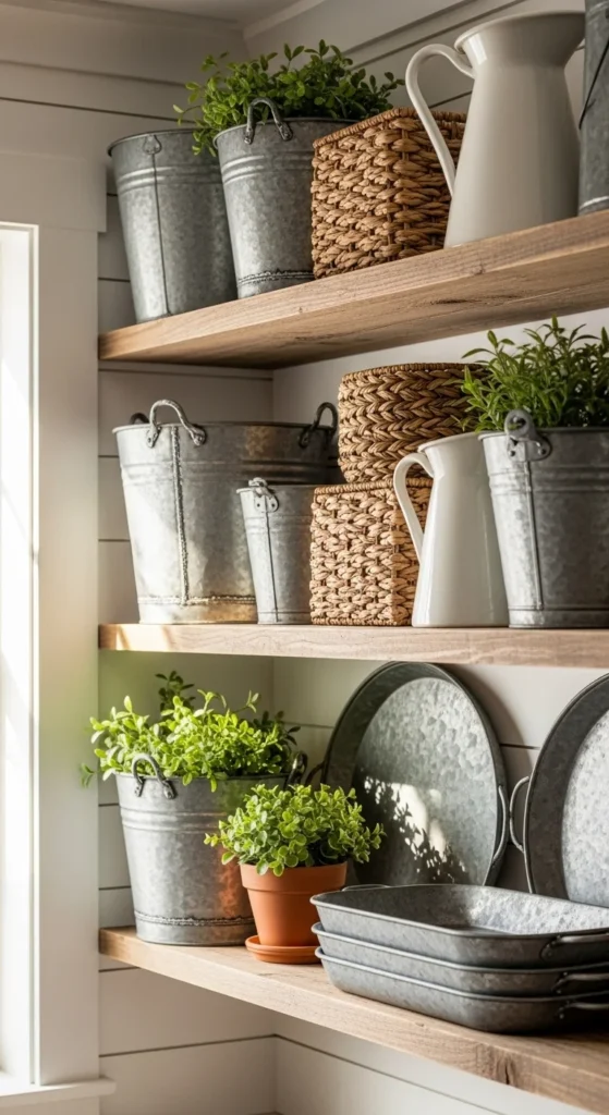 Galvanized metal is a farmhouse staple that adds vintage charm. DIY projects using metal containers create rustic contrast. They work beautifully with wood and greenery. These pieces feel both old-fashioned and practical. This decor style adds character without overpowering the space.
