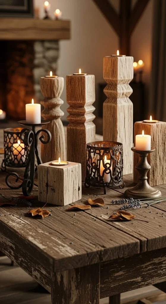 Candle holders instantly add warmth to farmhouse spaces. DIY holders made from wood or jars feel natural and cozy. Soft candlelight enhances the rustic atmosphere. They are perfect for tables or shelves. This decor creates a welcoming and relaxing mood.