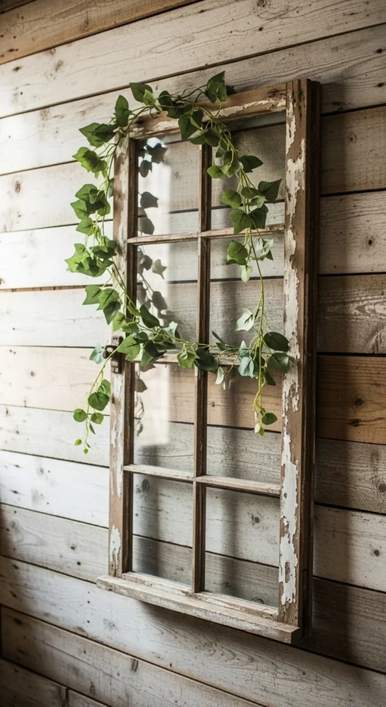 Old window frames make beautiful farmhouse wall decor. DIY restoration keeps their worn charm intact. They add history and texture to blank walls. Paired with greenery, they feel fresh and rustic. This piece creates a strong farmhouse statement.