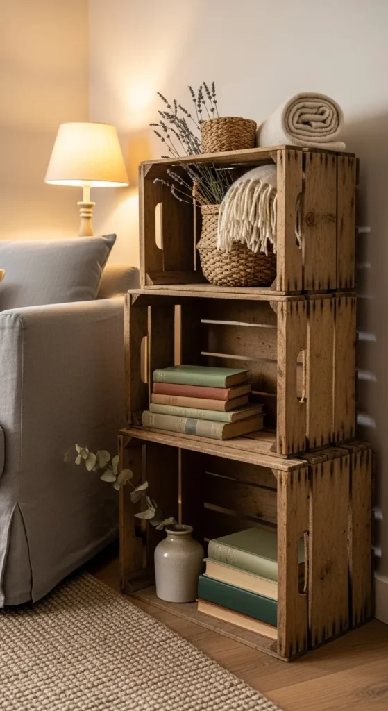 Wooden crates are practical and decorative farmhouse elements. DIY crates can be sanded or stained for a rustic finish. They work well for storing books or decor. The open design keeps the space light. This idea adds storage with charm.