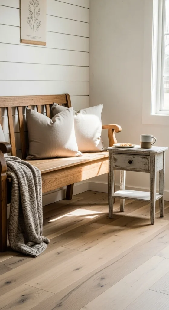 A farmhouse bench adds seating and warmth to a room. DIY benches allow custom sizing and finishes. Soft cushions improve comfort while keeping the look relaxed. This piece feels welcoming and functional. It fits beautifully in entryways or living areas.