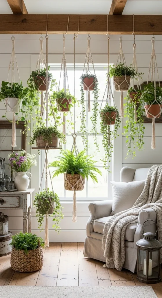 Greenery brings life into farmhouse interiors. DIY hanging planters add freshness without cluttering surfaces. Natural plants soften wood and metal textures. They create a calm, organic feel. This decor choice keeps spaces lively and warm.