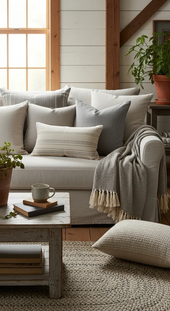Soft throw pillows in linen or cotton enhance farmhouse comfort. DIY pillow covers allow easy color coordination. Neutral tones keep the room calm and inviting. Mixing textures adds subtle elegance. This simple update instantly warms up seating areas.