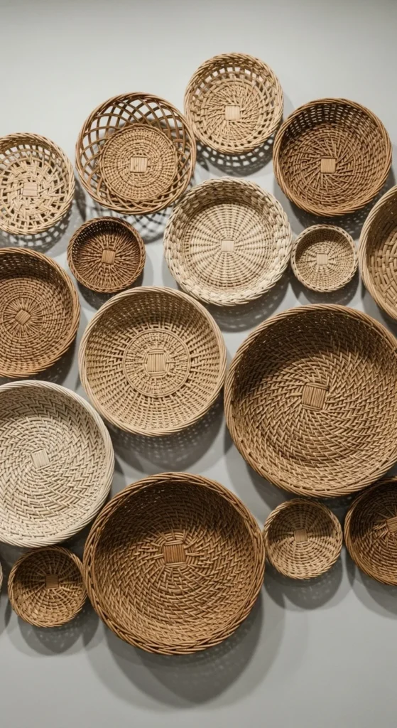 Woven baskets add texture and natural warmth to farmhouse walls. Hanging them as wall decor creates visual interest. DIY arrangement allows you to mix shapes and sizes. Neutral fibers keep the look soft and earthy. This idea adds depth without clutter.