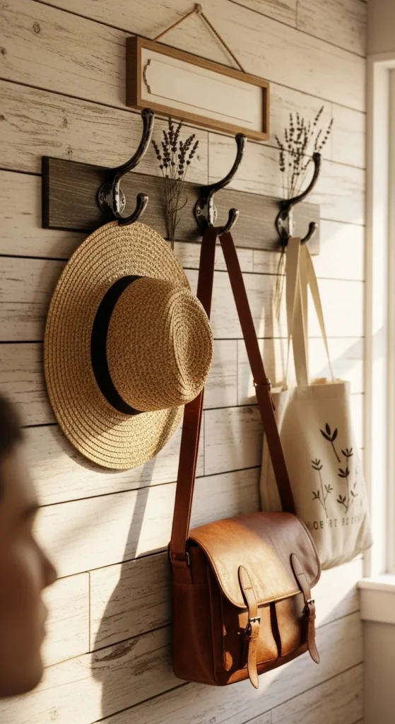 Farmhouse wall hooks combine beauty and function. DIY hooks made from wood and metal add rustic appeal. They help keep spaces organized while adding charm. Placed in entryways or kitchens, they feel practical and decorative. This idea is simple but impactful.