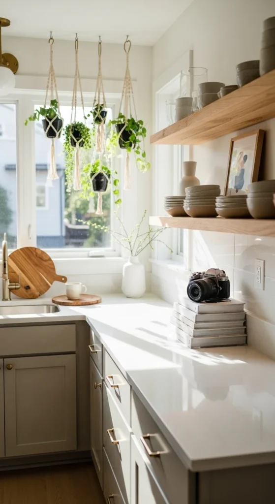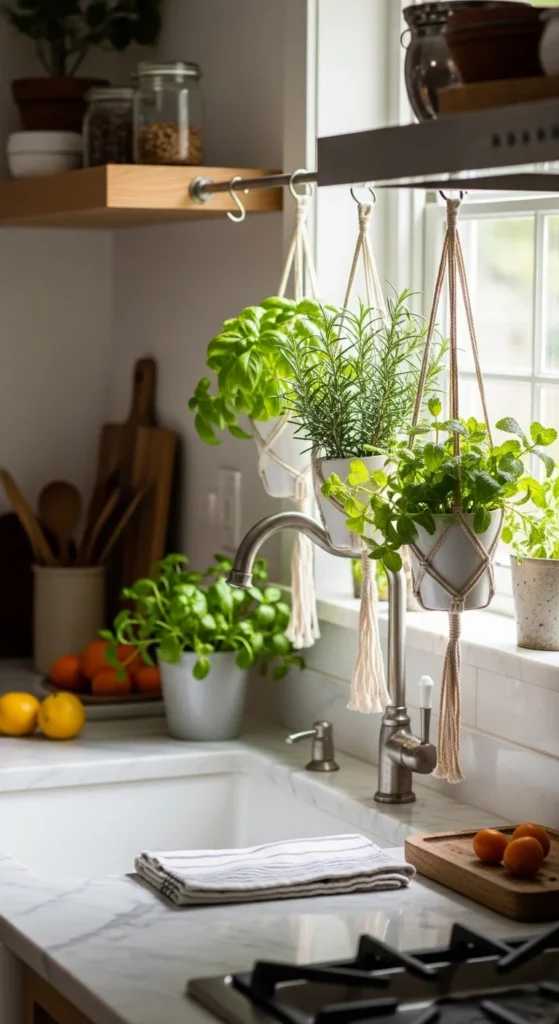 Hanging planters free up counter space while adding greenery. DIY using macrame or recycled containers. Fresh herbs improve cooking convenience and bring life to the kitchen. Placement near sunlight ensures growth and adds natural charm. Hanging planters are budget-friendly and visually appealing.