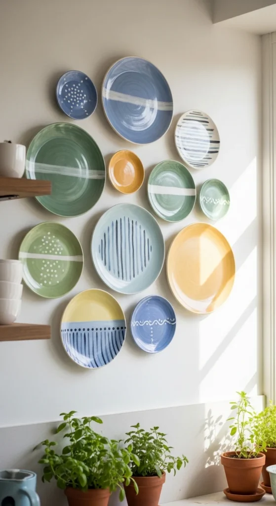 Decorative wall plates make an empty wall interesting. DIY painting or hand-decorating plates allows customization. Arrange them in grids or patterns for a statement display. Neutral or colorful designs add personality without overwhelming the space. This low-cost decor instantly elevates the kitchen’s style.