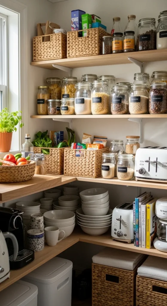 Organizing an open pantry creates both functionality and style. DIY labels, baskets, and jars keep everything tidy and easy to find. Arranging items by type or color adds a visually appealing element. Clear containers allow you to see contents at a glance, reducing clutter. This simple project makes your kitchen feel more organized and inviting.