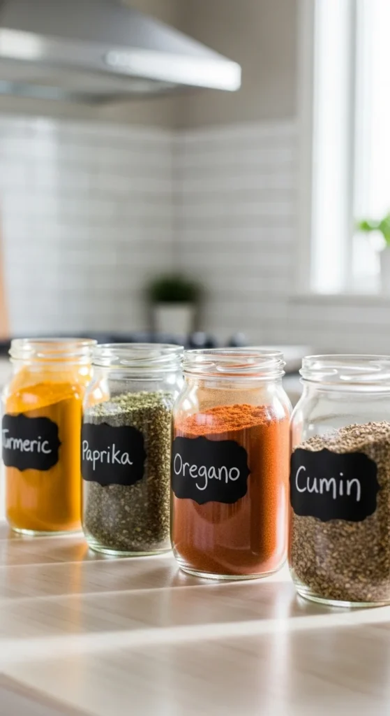 Magnetic spice racks save counter space and organize small containers efficiently. DIY using tin jars and magnetic strips or old lids. Clear jars allow easy identification of spices. Neutral or muted colors keep a minimalist vibe. This practical project elevates kitchen organization with minimal expense.