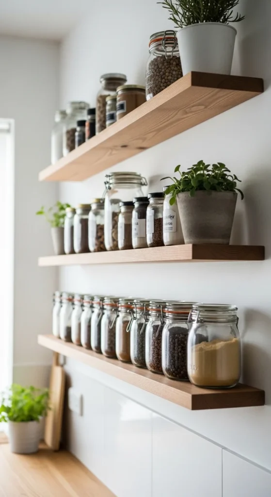 Floating shelves add storage and style without taking up counter space. DIY wooden shelves can be customized in length, finish, and placement. They allow you to display plants, spices, or decorative items in an organized way. Neutral wood tones complement any kitchen palette. This simple addition makes your kitchen feel open, airy, and stylish on a budget.