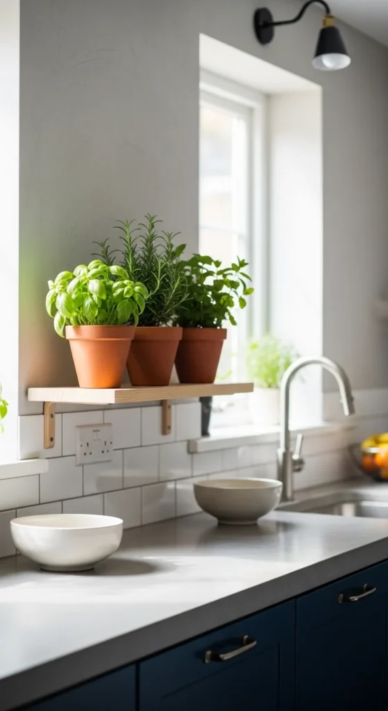Floating shelves with potted herbs provide fresh ingredients and greenery. DIY a simple wooden shelf or repurpose reclaimed wood. Herbs like basil, thyme, or rosemary are functional and visually appealing. Placing them near sunlight encourages growth. This project is low-cost but adds charm and practicality to the kitchen.