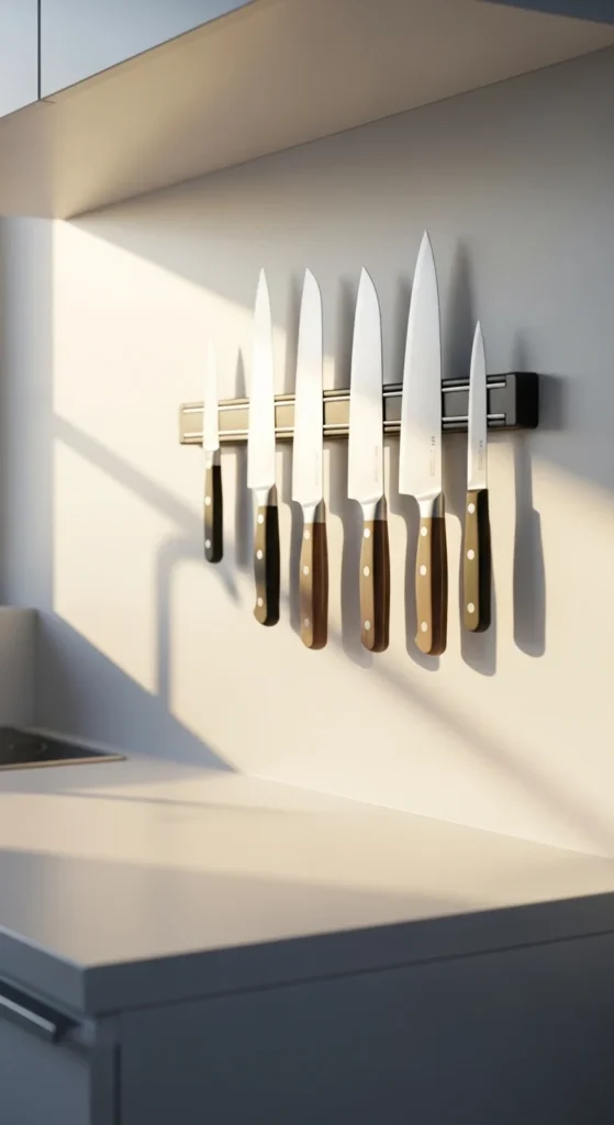 A magnetic knife strip frees up drawer space and creates an organized display. DIY installation is simple and safe. Knives are easy to access while maintaining a clean, streamlined look. Metal or wooden strips can be customized to fit your aesthetic. This small addition is practical, stylish, and budget-friendly.