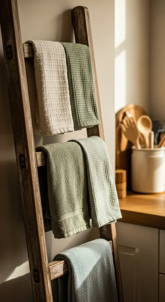 A repurposed ladder serves as both storage and décor. DIY sanding, staining, or painting allows customization. Towels, linens, or small baskets can hang from rungs. It adds vertical interest while saving counter space. This project is inexpensive and adds rustic charm to the kitchen ambiance.