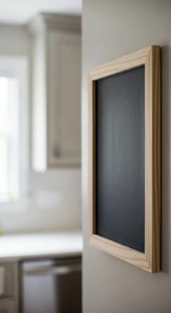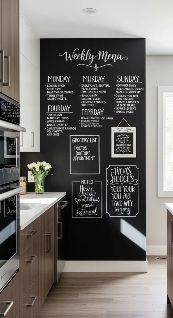 A chalkboard menu board is functional and decorative. DIY one using wood, chalkboard paint, or an old frame. You can write daily menus, grocery lists, or inspirational quotes. It keeps the kitchen organized while adding charm. Changing the text daily brings a fresh and dynamic look to the space. This low-cost project creates both style and utility.