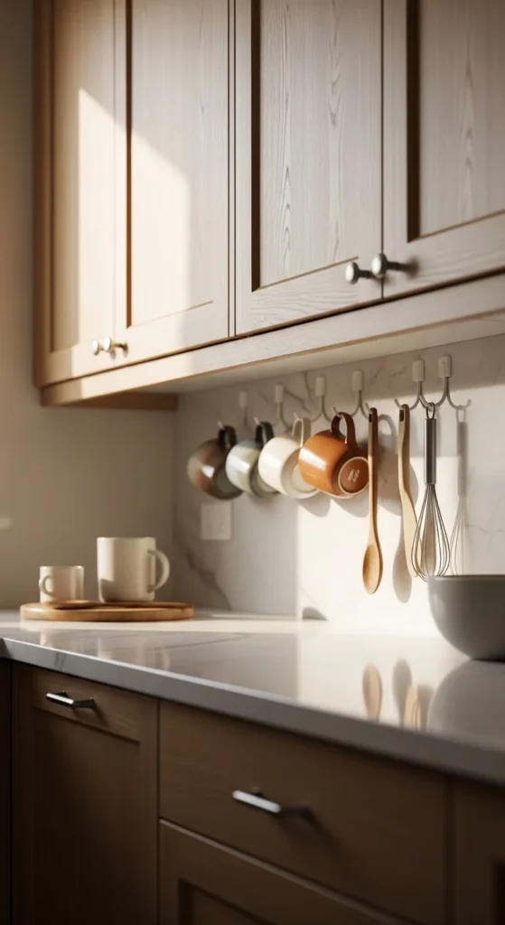 Hooks under cupboards save space and organize mugs or tools. DIY installation of wooden or metal hooks is affordable. Items are easy to reach and visually tidy. Neutral tones keep the design cohesive with the rest of the kitchen. This small addition enhances both utility and style.