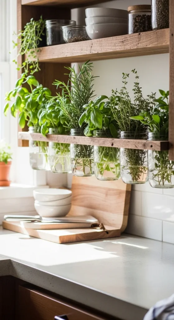 Growing herbs in mason jars is a practical and stylish idea. DIY a small rack or use a window sill to hold the jars. Fresh herbs are always handy for cooking and add vibrant greenery. Glass jars keep the look clean and organized. This inexpensive DIY project adds both function and beauty to your kitchen.