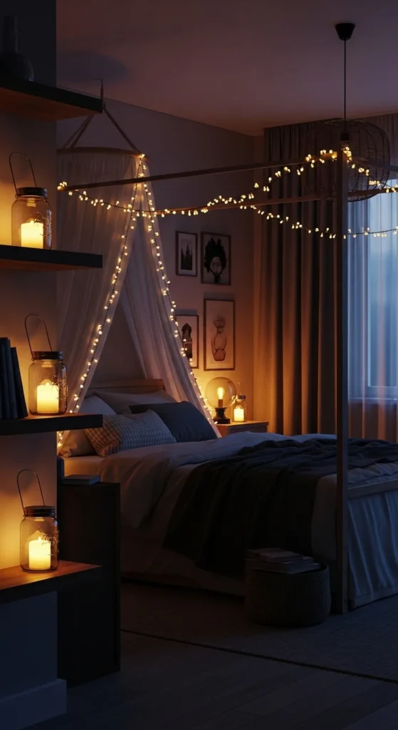 Create a dreamy atmosphere in your bedroom by draping fairy lights over a canopy or tented bed. Warm-white LEDs offer a soft, inviting glow, transforming any space into a magical retreat. You can weave the lights around sheer fabric or hang them in gentle curves for a whimsical effect. This DIY is both budget-friendly and instantly impactful, perfect for creating that cozy, starry-night feeling in your home