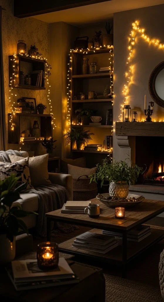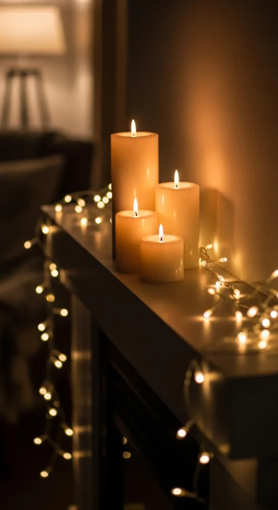 Combine real or flameless candles with fairy lights on your mantel for a romantic flickering glow. This layering technique enhances warmth while ensuring safety and versatility. It’s a perfect DIY for living rooms, seasonal décor, or special evenings. The combination creates a professional, cozy visual effect that draws attention.