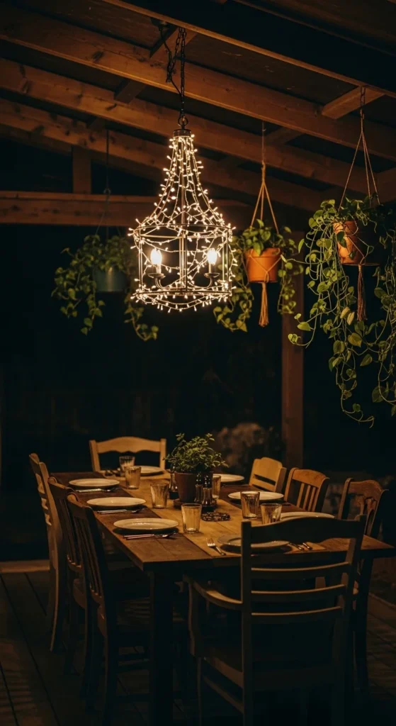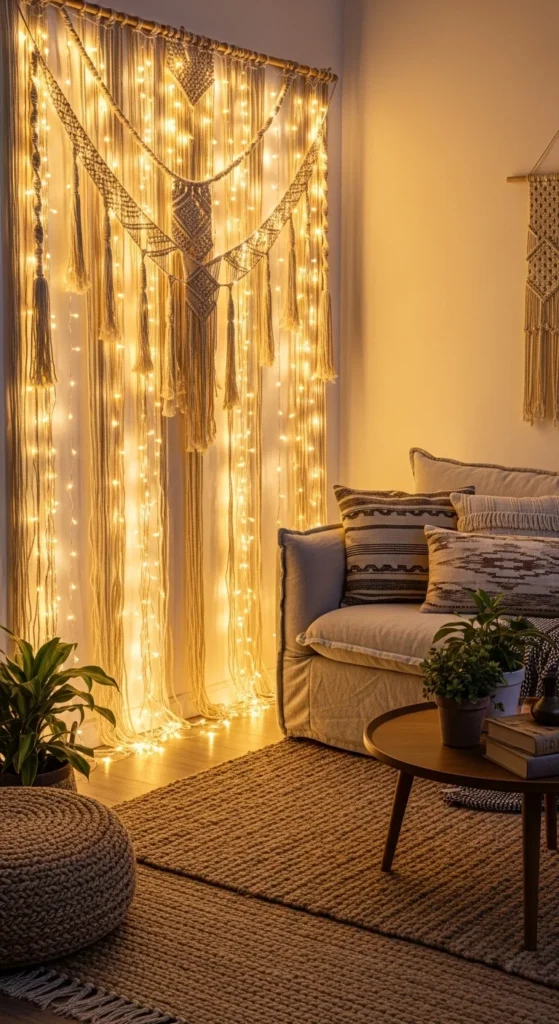 Wrap twine around small jars or glass containers and insert battery-operated LEDs to create rustic hanging lanterns. Cluster multiple lanterns at different heights for a dynamic, bohemian effect. This technique is ideal for living rooms or patios, offering a soft, warm glow that is both charming and inexpensive. The handcrafted touch adds character and a magical aura to your space.