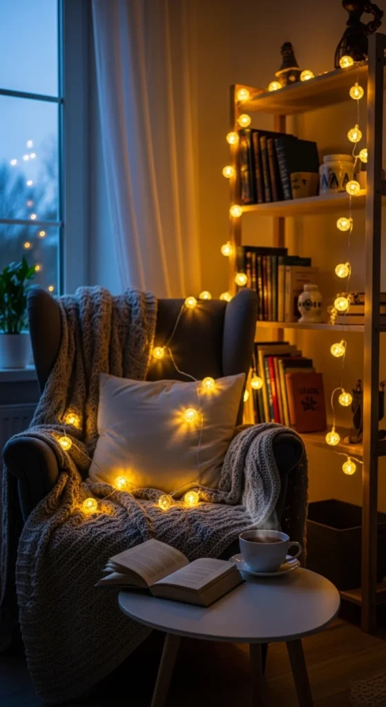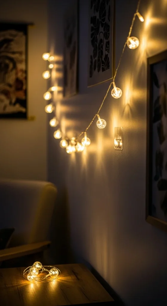Highlight cozy corners in your bedroom with soft fairy light installations. A warm glow creates an inviting atmosphere, ideal for reading or relaxing. Position lights around furniture, wall art, or headboards to enhance mood. This small adjustment can transform a simple corner into a magical retreat without major expense.