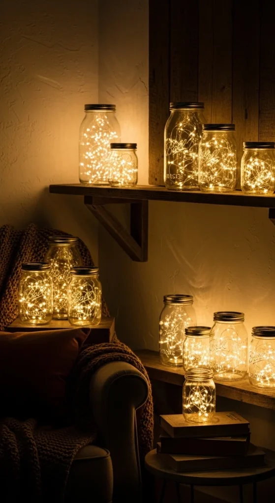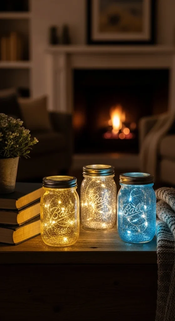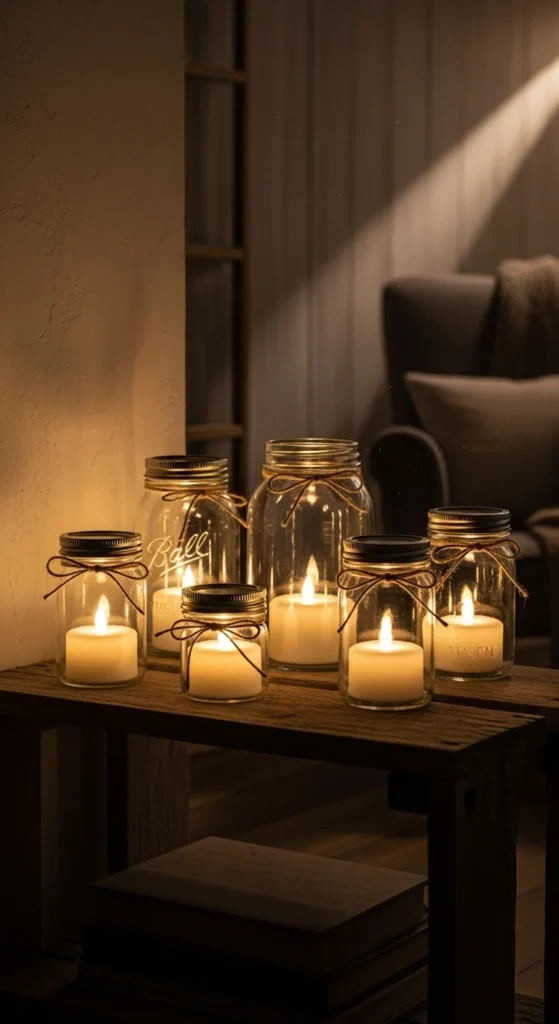 Use LED puck lights inside jars for safe, flameless illumination that’s ideal for kids’ rooms or tight spaces. This setup avoids fire hazards while providing a soft, diffused glow. You can paint or decorate the jars for extra style, making it a versatile and practical DIY project. Perfect for mantelpieces, shelves, or intimate corners.