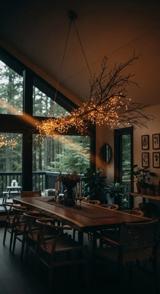 Transform simple branches into rustic chandeliers by suspending them from the ceiling with fishing lines. Wrap warm lights around each branch for a soft, enchanting illumination. This project brings an outdoor, forest-inspired feel indoors, perfect for dining or living areas. It’s an eco-friendly and creative way to add natural charm and a whimsical glow to your home décor.