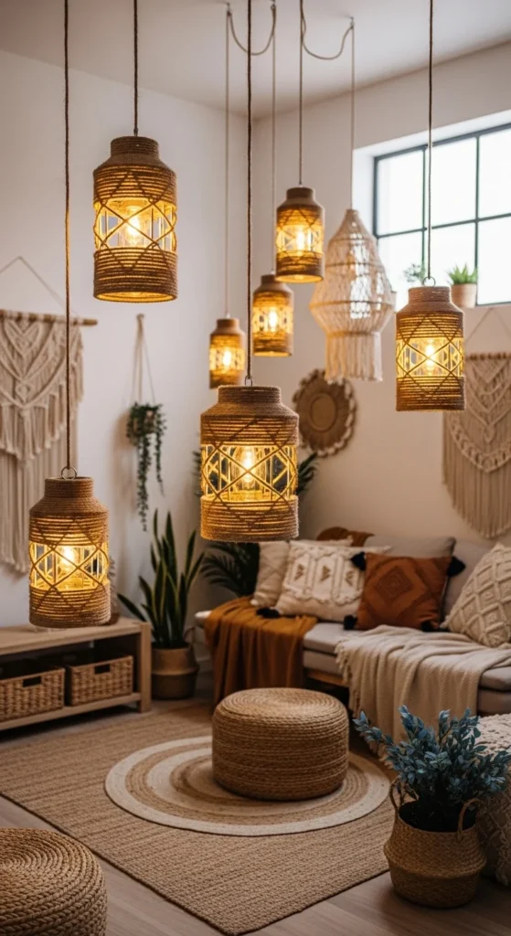 Twist and hang thick rope around light fixtures for a rustic, bohemian pendant effect. These lamps provide warm ambient light and add texture to ceilings and corners. Ideal for living rooms, kitchens, or patios, this DIY combines creativity with functional illumination. It’s a stylish way to elevate your home’s personality.