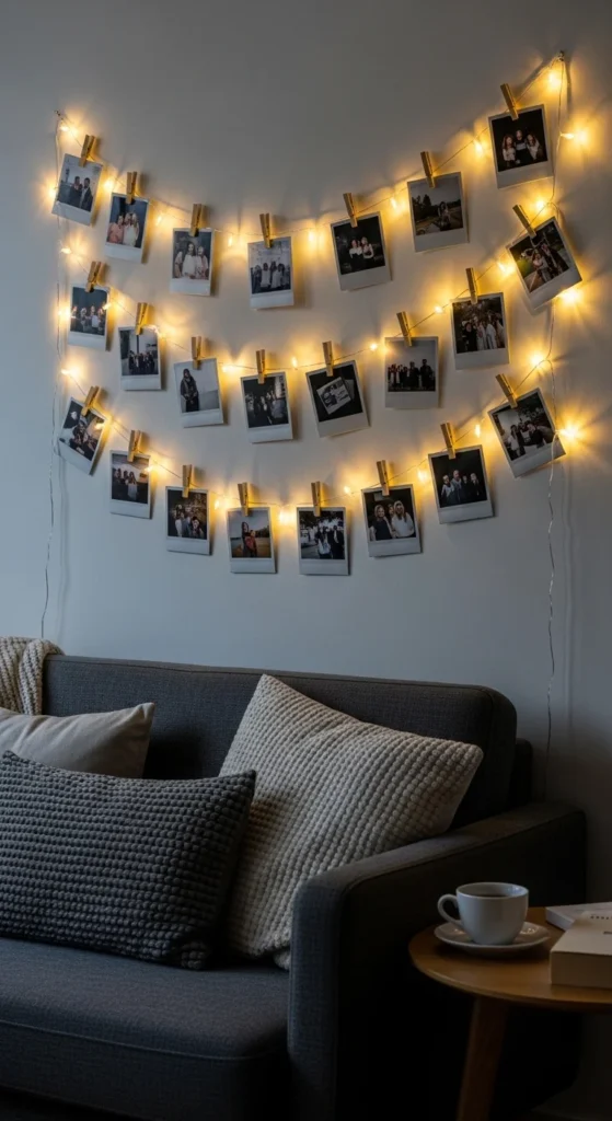 Combine memories with light by clipping photos onto a string of fairy lights using small clothespins. This creates a personalized wall display that glows softly in the evening. It’s a creative way to showcase travel, family, or art while adding warm, ambient illumination. The project is simple, renter-friendly, and endlessly customizable.