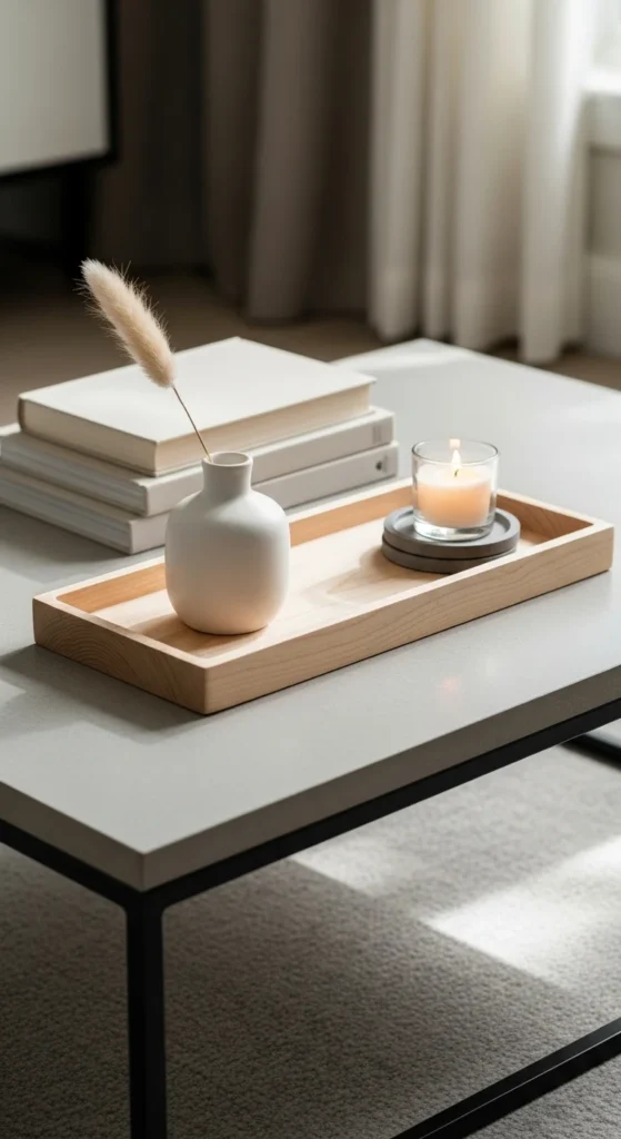 Decorative trays bring structure to surfaces. DIY trays in simple finishes look elegant. They organize items while keeping things stylish. Neutral colors maintain the modern aesthetic. This detail adds a refined touch.