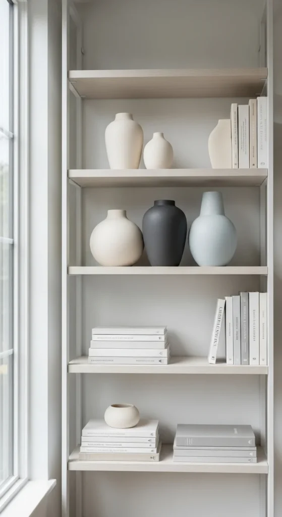 Open shelves can look luxurious when styled with intention. DIY shelf styling focuses on fewer items placed with balance and spacing. Neutral decor keeps the shelves from looking cluttered. Clean arrangements create a calm and designer feel. This idea works perfectly in small and large spaces alike.