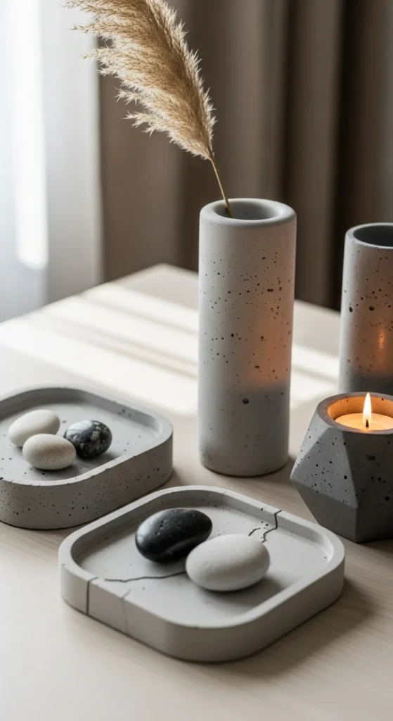 Concrete-style decor adds a bold and modern edge to interiors. DIY concrete textures are budget-friendly and very trendy. The raw look feels architectural and upscale. Neutral shades help balance the rough texture. These pieces add character without overpowering the space.