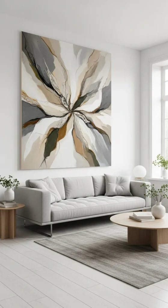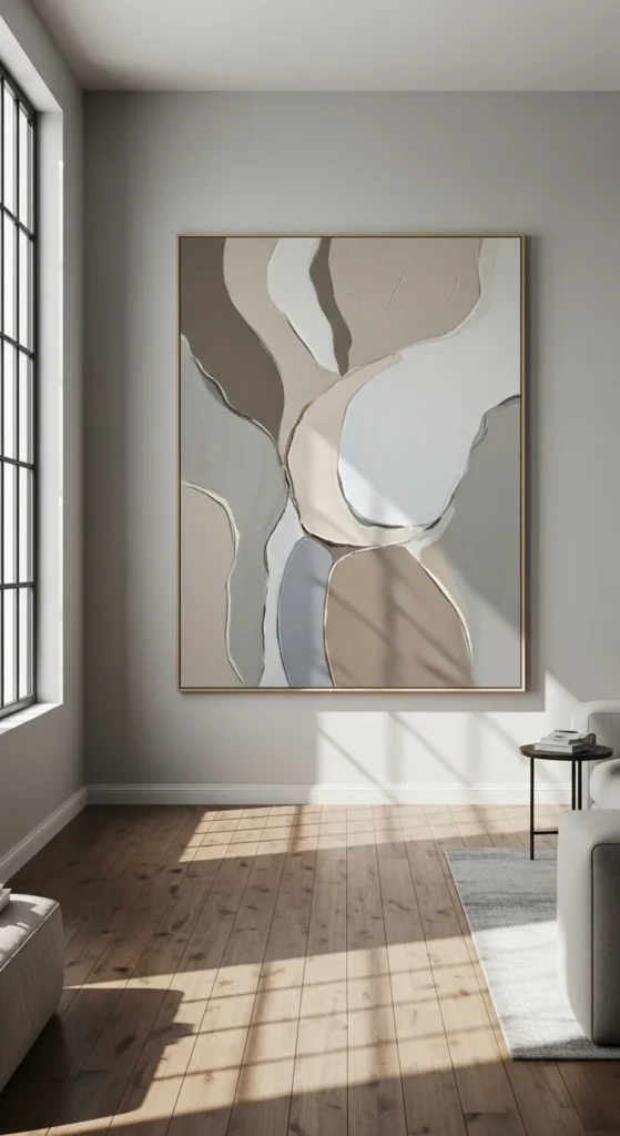 Large wall art makes spaces feel upscale. DIY abstract art allows control over colors and size. Neutral tones maintain a modern look. Oversized pieces add drama without complexity. This idea transforms blank walls effortlessly.
