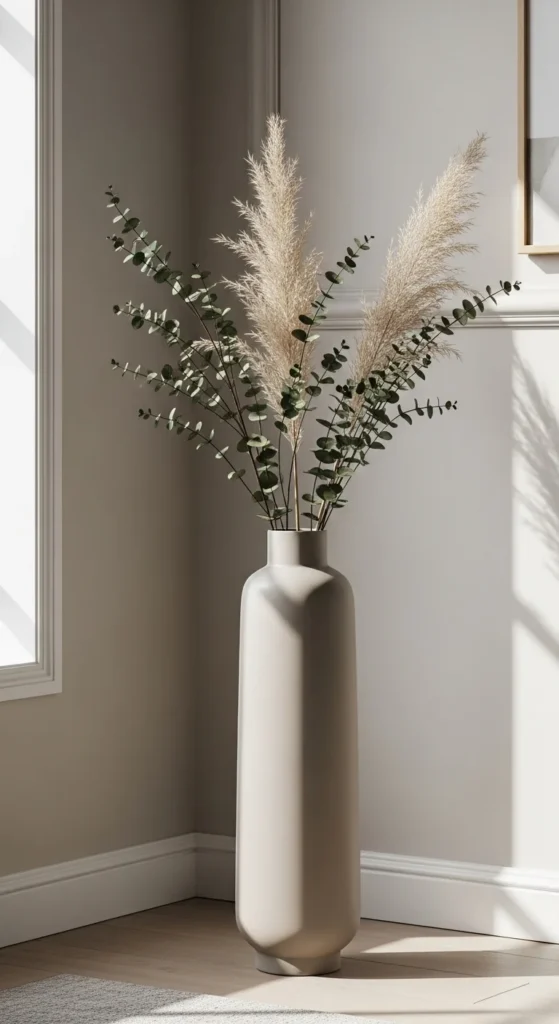 Floor vases add height and elegance to modern spaces. DIY styling keeps the look minimal and clean. Neutral colors help the vase blend into the decor. Adding simple greenery softens the overall look. This idea fills empty corners beautifully.