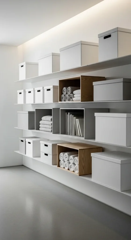 Stylish storage makes a space feel organized and expensive. DIY storage boxes hide clutter while maintaining a modern look. Clean lines and neutral colors keep everything cohesive. These boxes are both decorative and practical. This solution works well in living rooms and bedrooms.