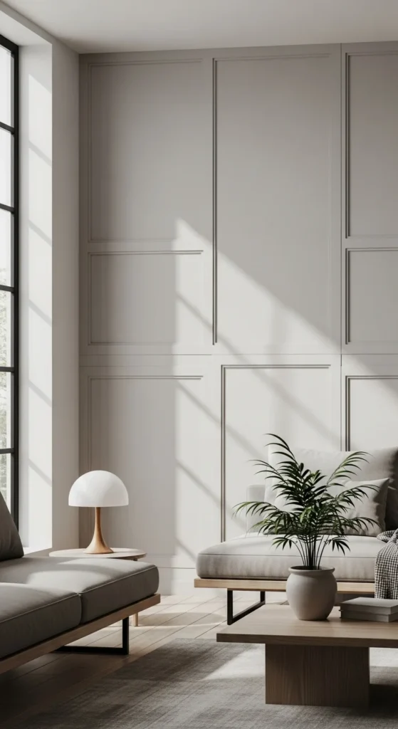 Accent wall panels add architectural interest to plain walls. DIY panels using simple materials look custom and expensive. Soft neutral colors enhance the modern aesthetic. This feature wall becomes a subtle focal point. It adds depth without overwhelming the room.