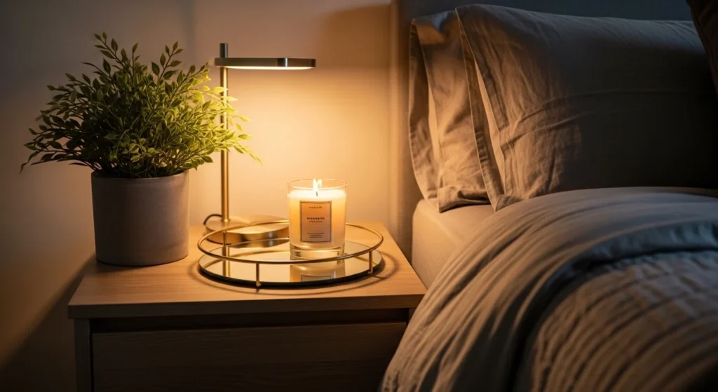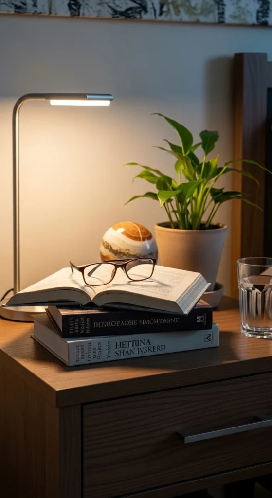 Highlight bedtime rituals with self-care items. Position a diffuser, journal, and water bottle neatly. Include a lamp for layered lighting. This style frames utility as decor while promoting calm sleep prep.