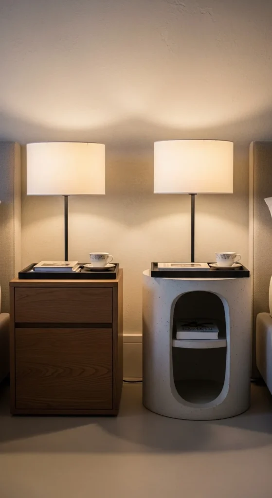 Mismatched nightstands can feel intentional when shared elements unify them. Match lamps, trays, or plants to tie the look together. Creates interest without chaos. Works especially well in master bedrooms with dual sleepers.