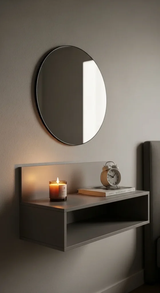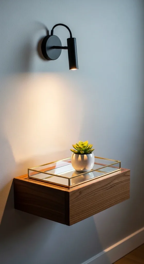 Combine a floating shelf nightstand with a wall-mounted mirror. Use a mirrored tray or candle for added light reflection. Ideal for small rooms that need more airiness. Quick DIY upgrade adds sophistication instantly.